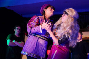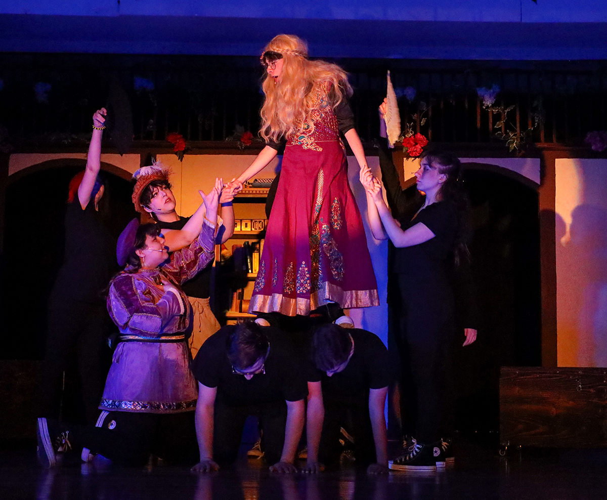 The play opens with Ana Torres (‘26) and Chase Stoerger (‘26) explaining the premise of the show and the importance of Shakespeare’s works. Samantha Szente (‘26) is then taken from her planted seat in the audience to give a brief biography of William Shakespeare, with questionable historical accuracy.